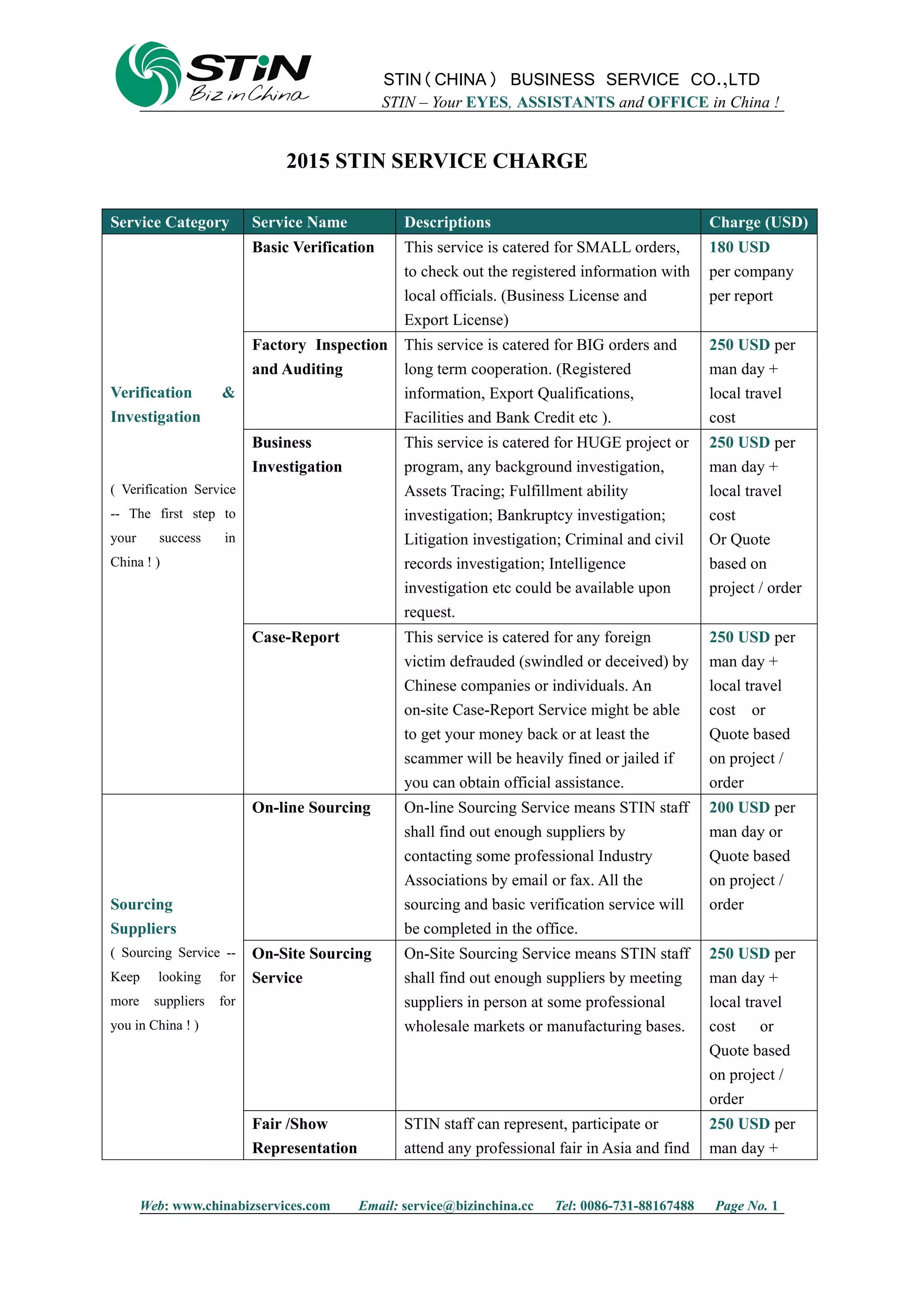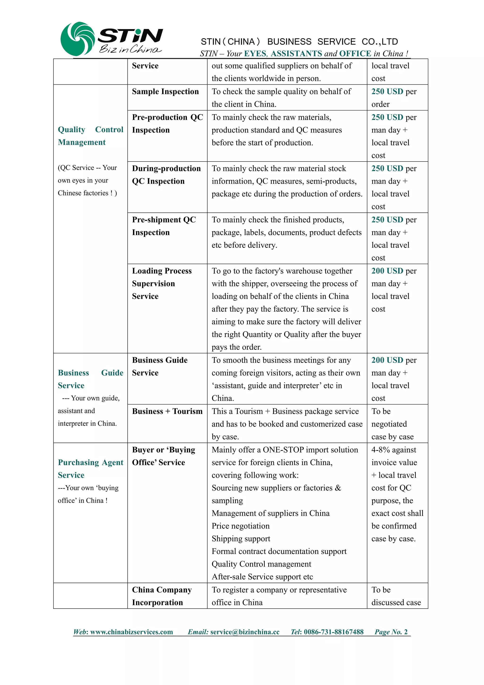 This document provides a list of business services and their associated costs offered by STIN(CHINA) BUSINESS SERVICE CO.,LTD. The services include verification of company and supplier information, factory inspections, sourcing of suppliers, quality control inspections during production, business guidance, purchasing agent services, and assistance with legal matters like company registration and intellectual property filings in China. Prices range from $180 for basic verification checks to 4-8% of invoice value for full purchasing agent services. It is noted that most costs are estimates and final pricing requires discussion depending on the specific needs and scope of each project.