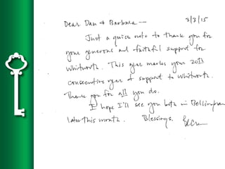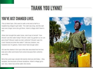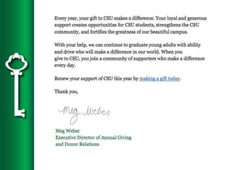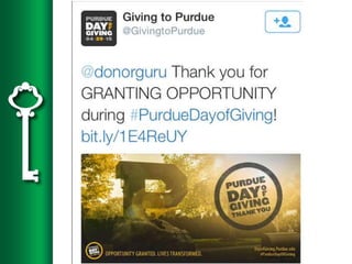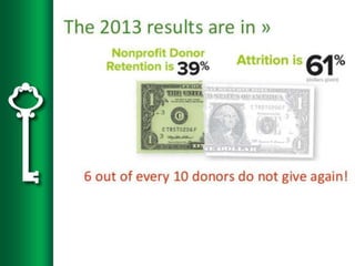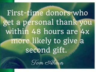 This document provides guidance for donor relations for annual giving donors. It emphasizes treating donors as individuals rather than transactions, and stresses the importance of using imaginative communications to inspire donors. It also lists several reports that are important to have to understand donor behavior and retention, such as giving history, lapsed donors, and increases in donations over time. The overall message is to focus on the donor experience rather than just acquiring donations.