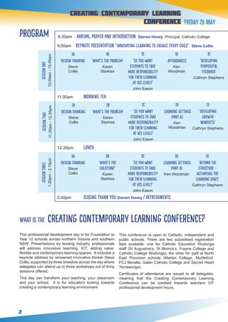 This document provides information about the "Creating Contemporary Learning Conference" to be held on Friday, May 29th at Catholic Education Wodonga in Australia. The one-day conference will feature keynote speaker Steve Collis and over 30 breakout sessions on topics related to innovative teaching, ICT, flexible learning spaces, and more. Educators from Foundation to Year 12 are invited to attend up to three workshop sessions from the schedule. Certificates of attendance will be provided for teacher professional development hours.