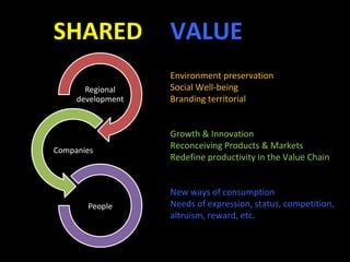 The document outlines a research project by Vincent Grèzes on creating shared value in regional development, particularly in tourism, during 2014-2015. It discusses the importance of branding, environmental preservation, and innovation in fostering growth, as well as methodologies to measure shared value. The document includes data on local tourism companies and emphasizes collaboration among various stakeholders in the Valais region.