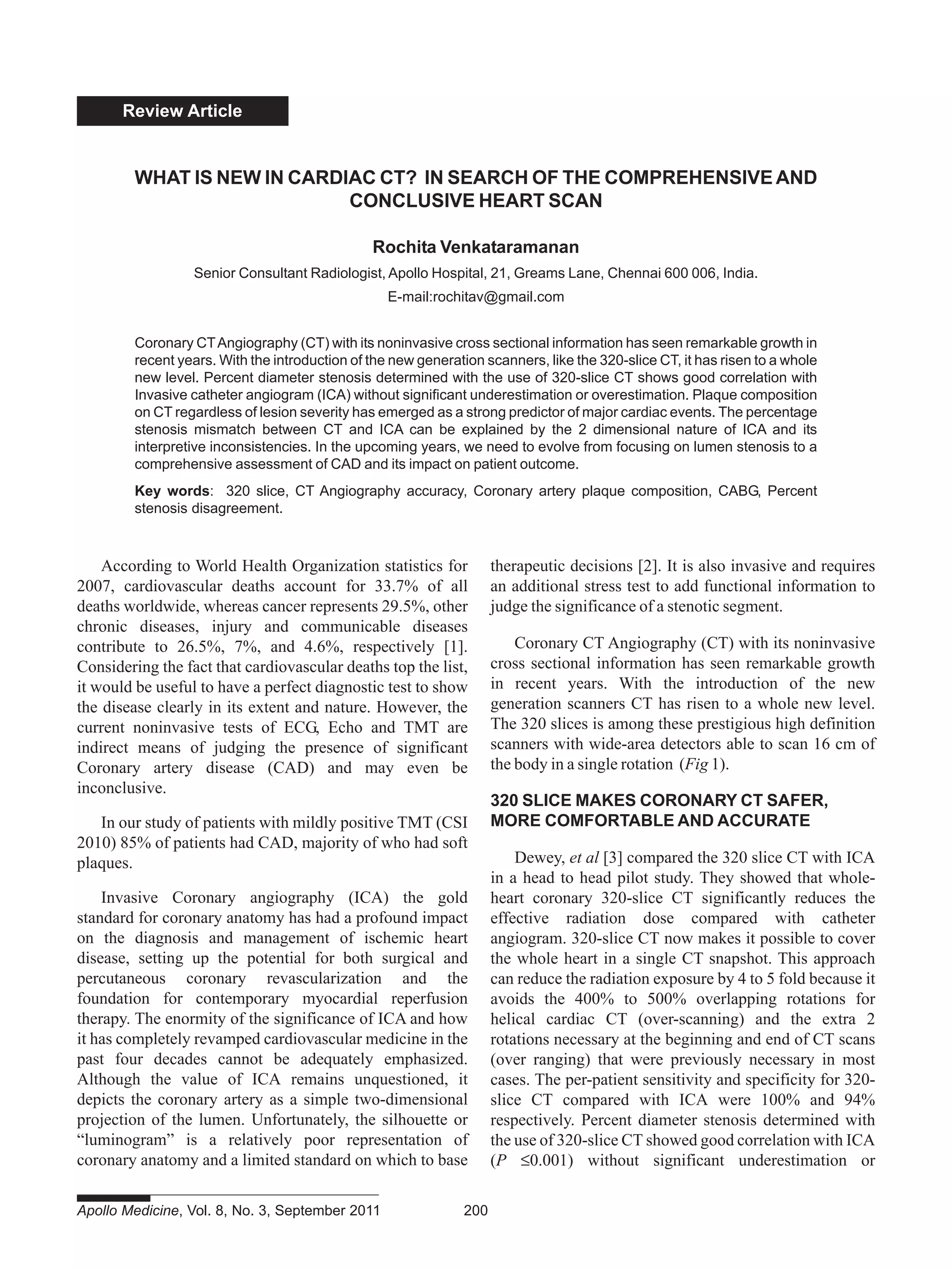 The document discusses advancements in cardiac CT, particularly 320-slice coronary CT angiography, which provides detailed, noninvasive imaging of coronary artery disease (CAD) and is shown to correlate well with invasive coronary angiography. It highlights the prognostic value of plaque composition detected by CT and its ability to improve patient outcomes, particularly in emergency situations. The paper advocates for a shift in focus from lumen stenosis to a comprehensive assessment of CAD and its implications for treatment and patient management.