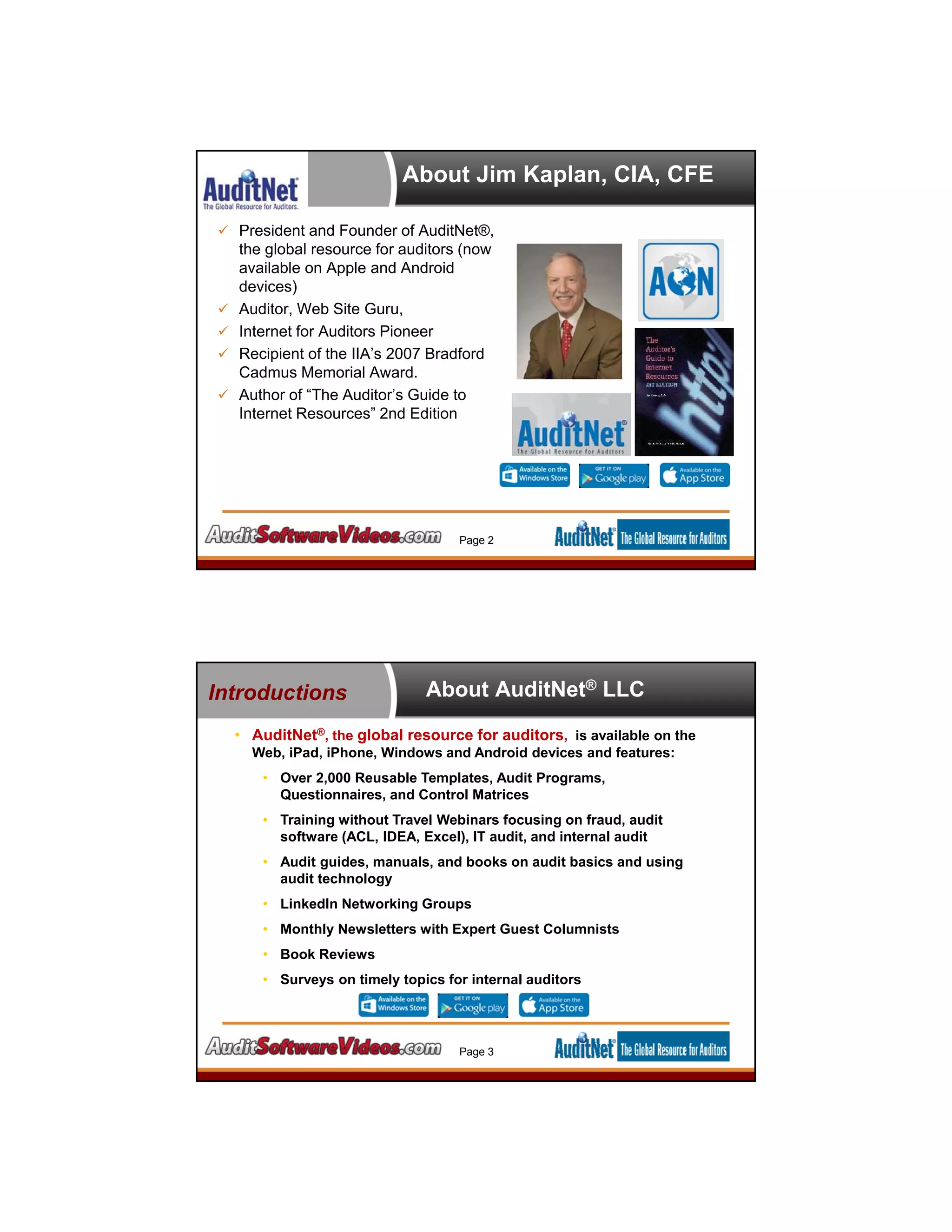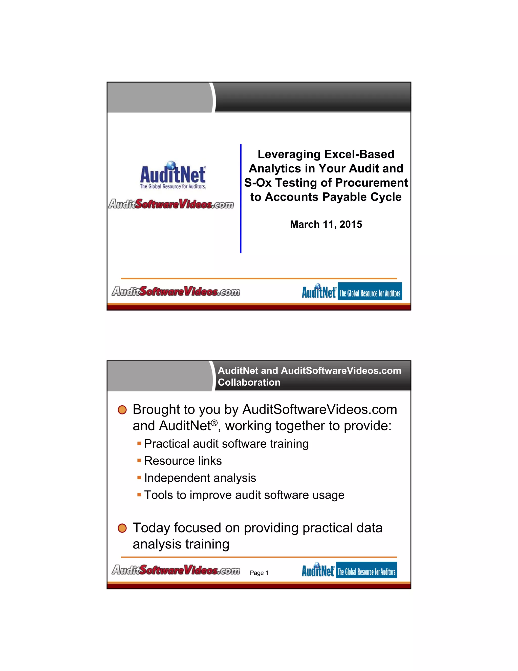 The document outlines strategies for utilizing Excel-based analytics in auditing and SOX compliance for the procurement to accounts payable cycle, highlighting various data analysis techniques to detect fraud and improve efficiency. It provides insights from seasoned auditors on developing analytic audit programs and emphasizes the importance of technology in identifying anomalies, managing fraud risk, and enhancing overall business processes. Additionally, comprehensive training resources, polling questions, and relevant disclaimers are included to support participants in these webinars.