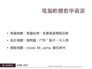 電腦軟體教學資源 • 電腦相關:電腦玩物、免費資源網路社群 • 設計相關:梅問題、ㄇㄞˋ點⼦子、⼤大⼈人物 •