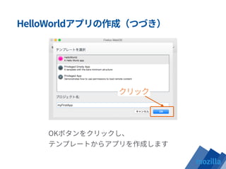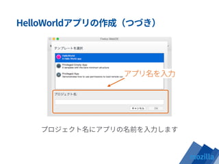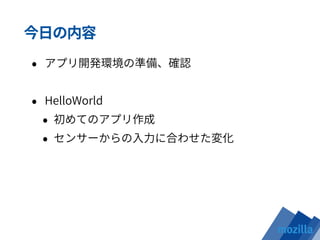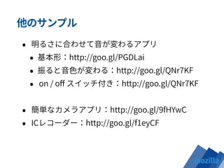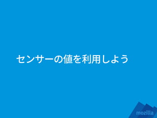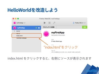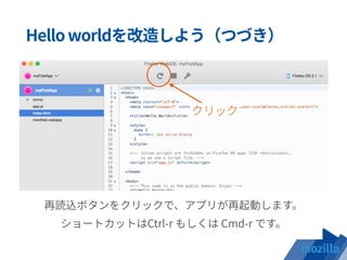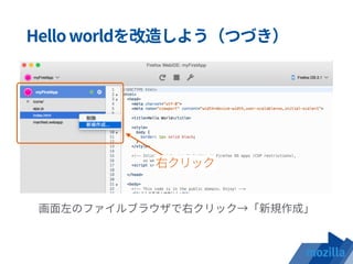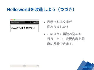 The document is a basic HTML webpage titled 'hello world,' featuring a large heading in Japanese that translates to 'Hello, World!' It uses CSS for styling and JavaScript for handling device light events to update the heading based on ambient light levels. The content includes links to an external CSS file and a JavaScript file, with device light event listeners set up for functionality.