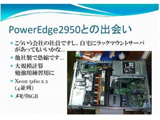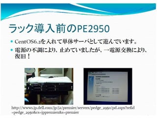 弊社製サーバも調達 • 不要になったサーバを数年前に入手。 今日の勉強会でも持ってきた。 活躍中・・・ • のはずでしたが、ネットワーク設定がうまくい かず、断念。あとで挑戦。
