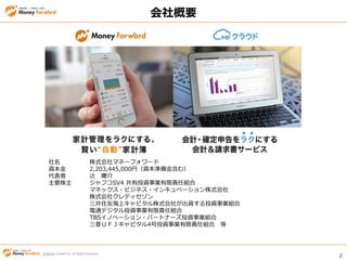 Inc. All Rights Reserved 2 © Money Forward Inc. All Rights Reserved 会社概要 株式会社マネーフォワード 2,203,445,000円(資本準備金含む) 辻 庸介 ジャフコSV4 共有投資事業有限責任組合 マネックス・ビジネス・インキュベーション株式会社 株式会社クレディセゾン 三井住友海上キャピタル株式会社が出資する投資事業組合 電通デジタル投資事業有限責任組合 TBSイノベーション・パートナーズ投資事業組合 三菱UFJキャピタル4号投資事業有限責任組合 等 社名 資本金 代表者 主要株主