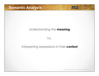 This document contains slides from a lecture on semantic analysis in programming languages. It discusses the key aspects of semantic analysis, including declaration and unicity, variable types, array indexes, condition types, return types, and parameter matching. It provides examples of code snippets and uses symbol tables to illustrate how semantic analysis would work for each example. The document is intended to teach students about semantic analysis and have them practice it through examples and exercises.