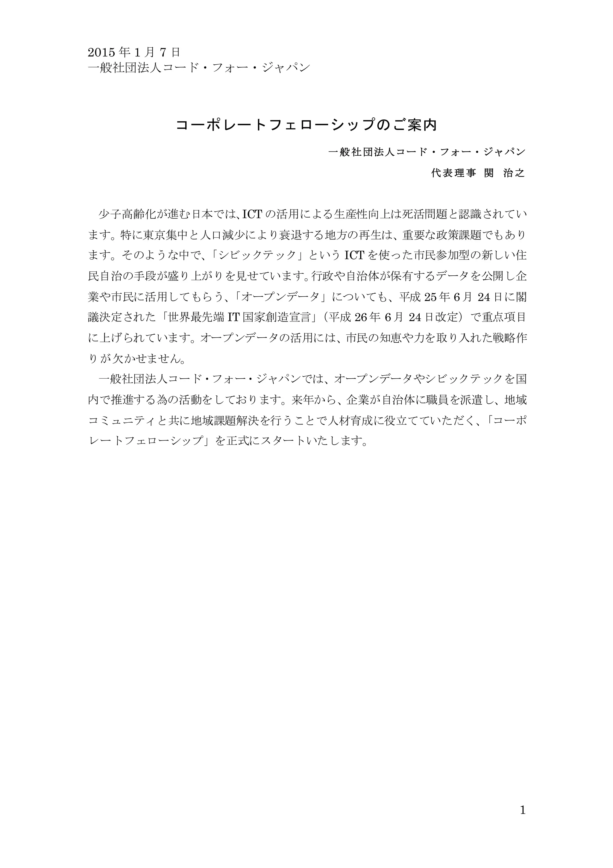 月 7 日 一般社団法人コード・フォー・ジャパン 1 コーポレートフェローシップのご案内 一 般 社 団法人コード ・フォー・ジャパン 代 表 理 事 関 治 之 少子高齢化が進む日本では、ICT の活用による生産性向上は死活問題と認識されてい ます。特に東京集中と人口減少により衰退する地方の再生は、重要な政策課題でもあり ます。そのような中で、「シビックテック」という ICT を使った市民参加型の新しい住 民自治の手段が盛り上がりを見せています。行政や自治体が保有するデータを公開し企 業や市民に活用してもらう、「オープンデータ」についても、平成 25 年 6 月 24 日に閣 議決定された「世界最先端 IT 国家創造宣言」(平成 26 年 6 月 24 日改定)で重点項目 に上げられています。オープンデータの活用には、市民の知恵や力を取り入れた戦略作 りが欠かせません。 一般社団法人コード・フォー・ジャパンでは、オープンデータやシビックテックを国 内で推進する為の活動をしております。来年から、企業が自治体に職員を派遣し、地域 コミュニティと共に地域課題解決を行うことで人材育成に役立てていただく、「コーポ レートフェローシップ」を正式にスタートいたします。