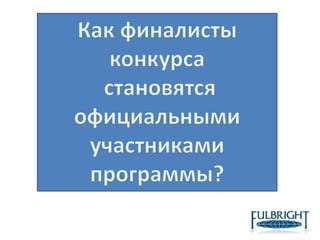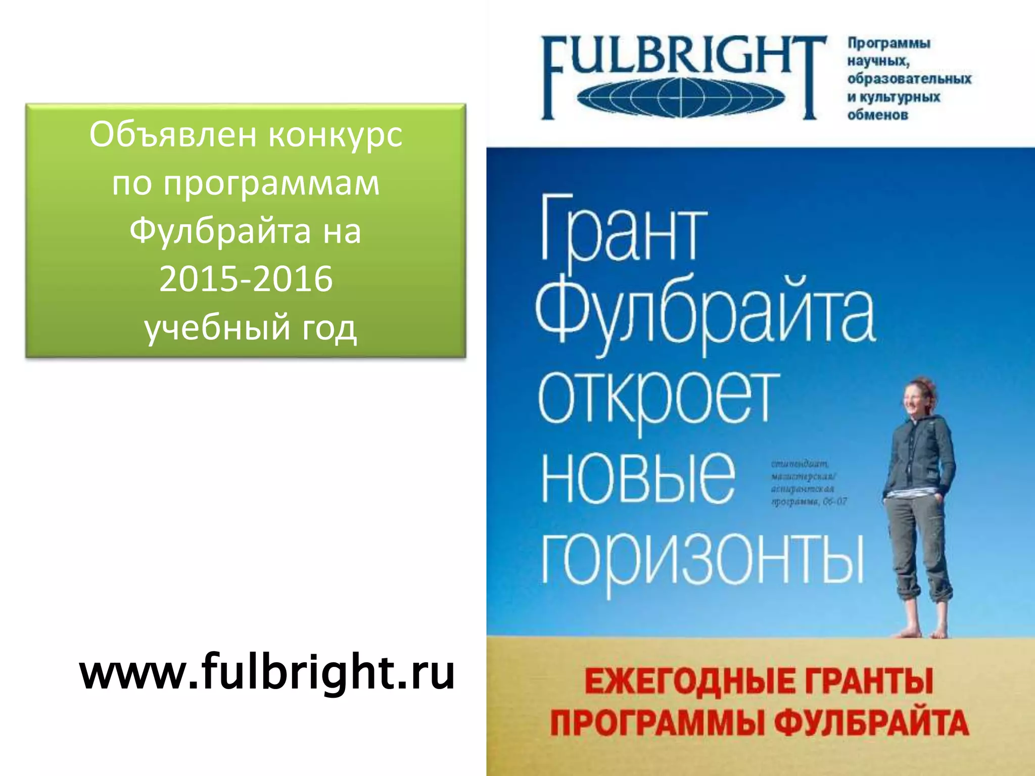 Объявлен конкурс Фулбрайта на 2015-2016 учебный год для российских выпускников и преподавателей, предлагающий различные программы, такие как магистерская/аспирантская, FLTA и программы для ученых. Претенденты должны соответствовать определенным требованиям, включая хорошее знание английского языка и возрастные лимиты. Заявки принимаются до мая-июля 2014 года в зависимости от программы.