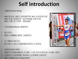 该文档是一份自我介绍,作者为孟繁儒,担任众多职务,包括P&G的市场经理和黑石集团的储备干部。作者兴趣广泛,包括运动、科幻小说和举办派对,并强调了两个重要职业习惯:从结果出发以及理解他人是沟通的关键。