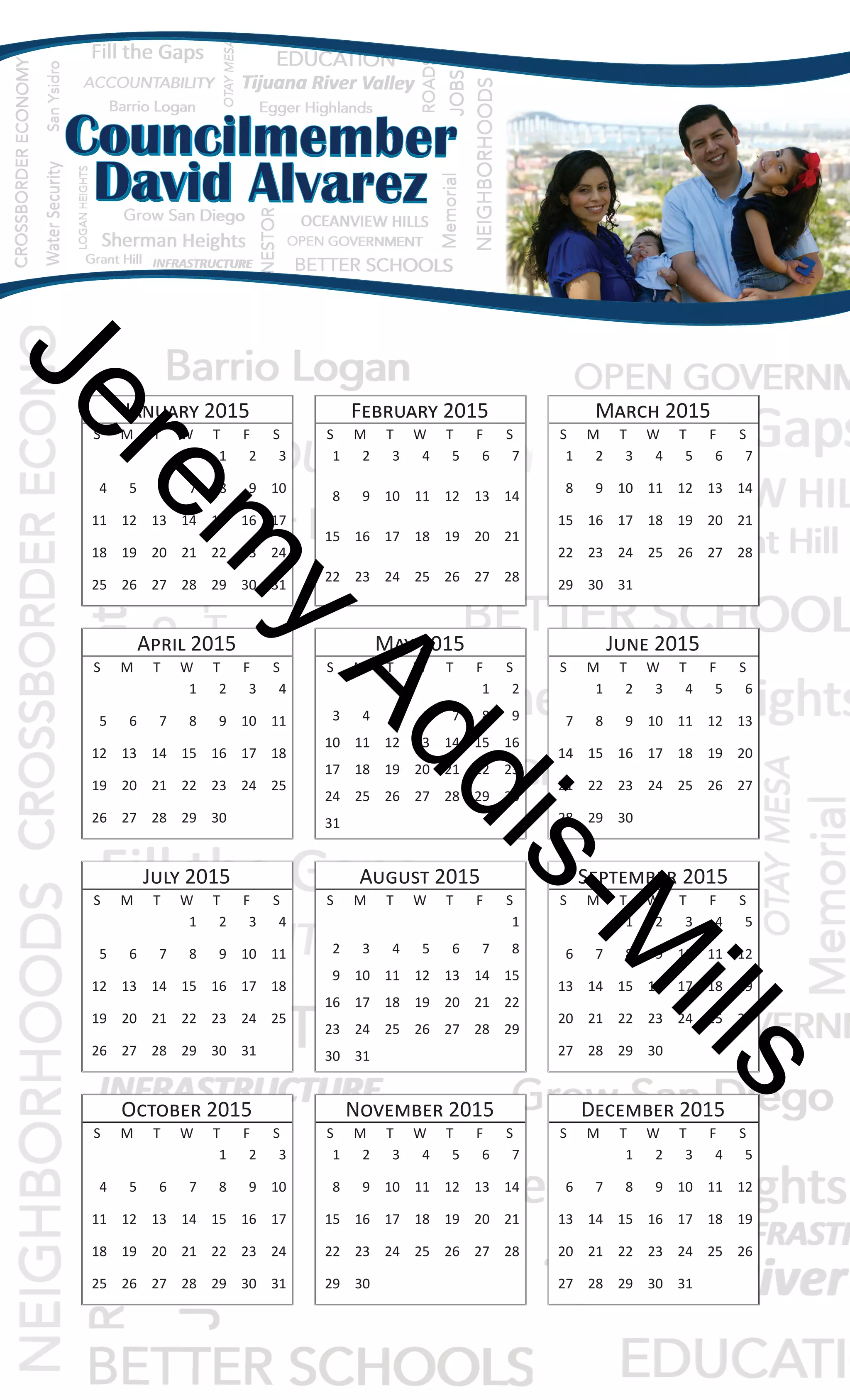 This document contains a calendar of months from January 2015 to December 2015. It also contains a letter from a Councilmember thanking someone for their time. The Councilmember discusses maintaining active community involvement through various outreach activities like office hours, town halls, and door-to-door outreach. The outreach helps provide insights into neighborhood and city needs. The Councilmember looks forward to working with others toward solutions. Contact information is provided if interested in a town hall, city board, or help with a city issue.