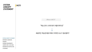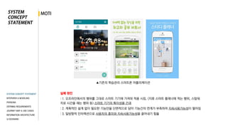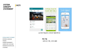 ๋งค์ฐ ๋ฎ์. ํนํ ๊ณต๋ถ๋ฅผ ์ํด IT ๊ธฐ๊ธฐ ์ฌ์ฉ์ ์์ ํ๋ ํธ์ด๋ค. ํ ๊ต์ค์ ๋ฐ ์ ๋๋ 2Gํธ๋ํฐ์ผ๋ก ๋ฐ๊พธ๊ณ , ๋๋จธ์ง ๋ฐ ์ค์์๋ SNS๋ฅผ ๋ ๋๋ค๊ณ ํ๋ค. ๊ณต๋ถ ๋๊ธฐ๋ถ์ฌ: ๊ฟ์ ์ด๋ฃจ๊ธฐ ์ํด ๊ณต๋ถ๋ฅผ ํ๋ ๊ฒ์ด ์๋๋ผ, ๋จ์ง ์ข์ ๋ํ๊ต๋ฅผ ์ํด์ ๊ณต๋ถํ๋ ๊ฒฝํฅ์ด ์๋ค. ๊ณต๋ถ๋ฅผ ์ ํด์ผ ํ๋์ง ๋ชฉํ๋ ๋๊ธฐ์ค์ ์ด ์ ๋๋ก ์ ๋ ์ด ์๋ค. ์ข์ ๋ํ๊ต๊ฐ ์ธ์์ ์ ๋ถ๋ผ๊ณ ์๊ฐํ๋ ๊ฒ์ ๋ฌธ์ ๊ฐ ์๋ค. ๊ณต๋ถ๋ฅผ ํด์ผ ํ๋ ๋ชฉ์ ์ด ์ ํํด์ผ ์ ๋๋ก ๋ ๋๊ธฐ ๋ถ์ฌ๊ฐ ๋ ๊ฒ์ด๋ค. ๊ณต๋ถ ์๊ทน: ์์ ์ ์ฌ๊ฐ์ฑ์ ๊นจ๋ซ๋ ๊ฒ์ด ํฐ ์๊ทน์ด ๋๋ค. ํ์ฌ ์ํฉ์ ์ง์ํ๊ณ ์๊ธฐ์ํค๋ ๋ฐฉ์์ผ๋ก ์๊ทน์ ์ํจ๋ค. ๊ณต๋ถ ํํธ๋: ํํธ๋๊ฐ ๊ณต๋ถ๋ง ์ํค๋ ๊ฒ์ด ์๋๋ผ ๊ฐ์ด ๋๊ฑฐ๋ ์ฌ๊ธฐ๋ ํด์ผ ํ๋ค. ์ฌ๋ฏธ์๋ ๋ํ์ํ์ ๋ํ ์ฌ๋ด์ ํ๋ฉฐ ์ฌ๋ฏธ๋ฅผ ์ฃผ๋ ๊ฒ๋ ์ข๋ค. ์กฐ์ธ: ์๊ทน์ด ๋๋ ๋ง๋ ์ค์ํ์ง๋ง, ๋ง์์ ์๋กํ๋ ๋ง์ด ๋ ์ํฅ์ด ํฌ๋ค. ์ํ์์ ์๋ฐ๊ฐ์ด ํฌ๊ณ , ์คํธ๋ ์ค๋ฅผ ๋ง์ด ๋๋ผ๋ ์ํ์ด๋ค. โ์๊ณ ํ์ดโ โ์ํ์ดโ โ์ ํ ๊ฑฐ์ผโ ๋ฑ์ ์๋ก์ ๋ง์ ์ํ๊ณ ์๋ค. ๊ณต๋ถ ๊ฐ์ ์ฑ: ํ์คํ ๋ณด์์ด๋ ์ฒ๋ฒ, ๊ฐ๋ ฅํ ์๊ทน ๋ฑ์ผ๋ก ๊ฐ์ ์ฑ์ ๋ถ์ฌ ๋ฐ๊ธฐ๋ฅผ ํ์๋ค๋ ์ํ๊ณ ์๋ค. ๊ณต๋ถํ ๋ ์ค์ค๋ก ๋ชจ๋ ๊ฒ์ ํ๋ ๊ฒ์ ํ๊ณ๊ฐ ์๊ณ ์ผ์์ค๊ณผ ๊ฐ ์ ํ๊ฒฝ์ ์ํ๋ ์ด์ ์ด๊ธฐ๋ ํ๋ค. ํ์ง๋ง ๊ฐ์ ์ฑ์ด๋ ๊ฒ์ด โ์ซ์ด๋ ํ๊ฒ ํด์ค๋คโ๋ ์ ์์ ํ์ํ๋ค๋ ๊ฒ์ ๊ณ ๋ คํ๋ฉด,์ ๋๊ฐ ์ง๋์ณ์๋ ์ ๋๋ค. ํนํ ์ค๋งํธ์์น ๋ ๋ณธ์ธ์ด ์ ์ฐจ๋ฉด ๊ทธ๋ง์ด๊ธฐ ๋๋ฌธ์ ๋์ฑ ์ฃผ์๋ฅผ ๊ธฐ์ธ์ด์ผ ํ๋ค. ์๋ฐํ ์ค์ : ํ์๋ค์ ๋ฏ์ ์บ๋ฆญํฐ๋ณด๋ค ์๋ ์๊ณ ์๋ ์น๊ตฌ๋, ์์ ์ ๋ถ๋ชจ๋์ ํตํด์ ์กฐ์ธ์ ๋ฃ๊ธฐ๋ฅผ ์ํ๋ค. ์ด์ฉ์์ ์ทจํฅ๋๋ก ์ค์ ํ๊ณ ์ถ์ดํ๋ค. ์๋ฅผ ๋ค์ด ์๋ฐ ํ์ ์ผ๊ตด์ ์นํ ์น๊ตฌ์ ์ผ๊ตด์ ๋ถ์ฌ๋๊ฑฐ๋ ์ฐ์์ธ์ ์ผ๊ตด์ ๋ถ์ฌ๋๋ ๋ฑ์ด๋ค. ์น์๋๋ฅผ ๋๋ผ๋ ๋งํผ ์ํฅ๋ ฅ์ด ํฌ๊ณ ,๊ฐ์ ์ด ๊ฐ์ ํ๋ค. ๊ธฐ๋ฅ: ์ฌ๋ฌ๊ฐ์ง ๊ธฐ๋ฅ์ ํจ๊ป ์ฌ์ฉํ ์ ์์ด์ผ ํ๋ค. ์์ด ๋จ์ด๋ฅผ ์ฐพ๋ ์ฌ์ ์ผ๋ก์์ ๊ธฐ๋ฅ, ์คํ์์น ๊ธฐ๋ฅ, ์๋ ๊ธฐ๋ฅ ๋ฑ์ด๋ค. ์์ ์ ๋์๋ณด๋ ๊ธฐ๋ฅ ๋ฑ๋ ํ์ํ๊ณ , ๋ชฉํ ๋ฅผ ์ด๋ฃจ๊ธฐ ์ํด ๋ฌด์์ด ๋ถ์กฑํ๊ณ ๋ฌด์์ด ์ ๋๊ณ ์๋์ง ์ฒดํฌํด์ฃผ๋ ๊ธฐ๋ฅ๋ ์์ผ๋ฉด ์ข๋ค. ์ฌ์ฉ์: ๊ณต๋ถ๋ฅผ ๋ฐฉํดํ ์ ์๋ ๊ธฐ๋ฅ์ ์ต์ํํด์ผ ํ๋ค. ๊ณต๋ถ์ ์ง์คํด์ผ ํ๋ฏ๋ก ์ฌ์ฉ์ ์ํด ๋ง์ ๋ฐ์ดํฐ๋ฅผ ์ ๋ ฅํด์ผ ํ๋ ๊ฒ์ ์ข์ง ์๋ค ์คOO/ 19์ธ ์ฌ ๊ณ ๋ฑํ์