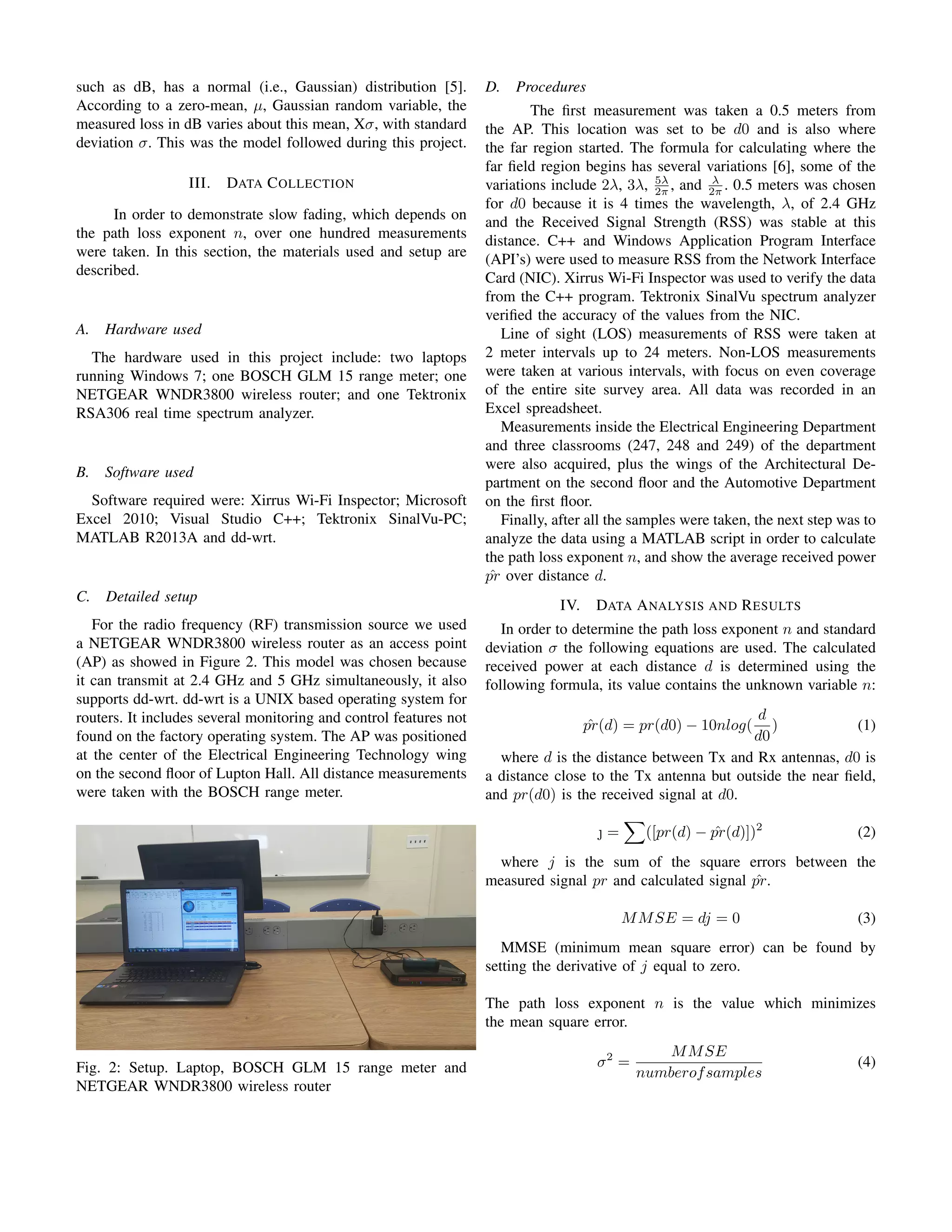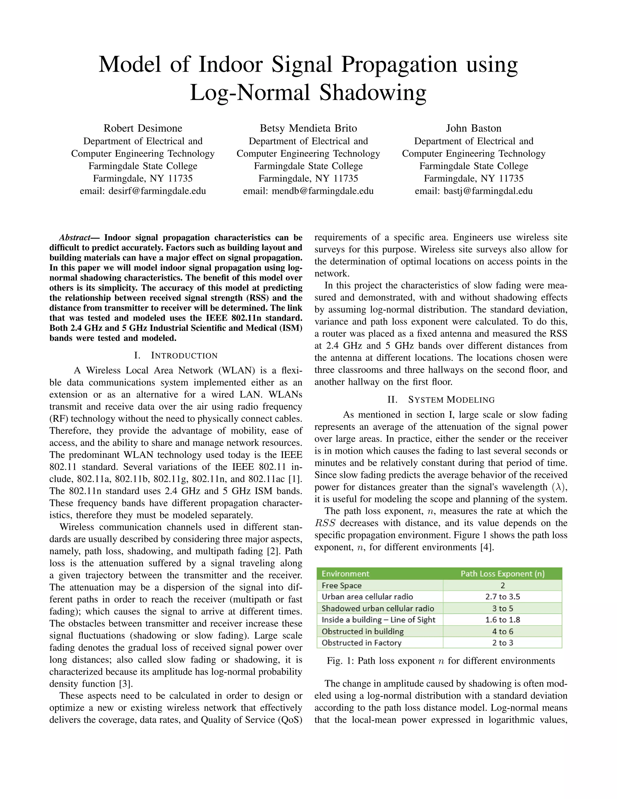 This document models indoor wireless signal propagation using log-normal shadowing. It collected over 100 RSS measurements in different locations and distances from an access point transmitting at 2.4GHz and 5GHz. It analyzed the data to determine the path loss exponent n and standard deviation σ for each band. For 2.4GHz, n=2.31 and σ=6.42, accurately predicting signal levels within 30 meters of the access point. For 5GHz, n=2.55 and σ=7.58, accurately predicting signal levels within the test areas. The model provides a simple yet reasonably accurate way to predict indoor wireless coverage.