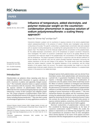 This document discusses the influence of various factors on counterion condensation in aqueous solutions of sodium polystyrenesulfonate polyelectrolyte. Electrical conductivity measurements were used to analyze the interactions between the polyion and counterions. The extent of counterion condensation was found to be affected by the polyelectrolyte concentration and molecular weight, added electrolyte concentration, and temperature. The results provide insight into how polyelectrolyte molecular weight influences counterion condensation behavior in the presence of added electrolytes.