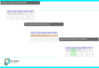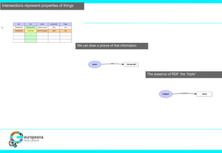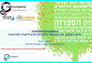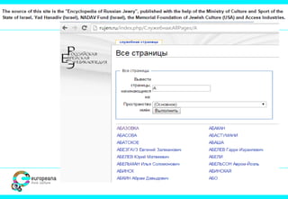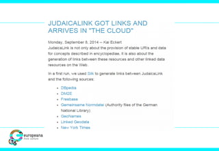 The document discusses the Judaica Europeana project, which aims to digitally archive and provide access to Jewish content in Europe, highlighting the significance of creating a structured web of knowledge for Jewish studies. It emphasizes the importance of common data models and controlled vocabularies to enhance data integration in digital humanities. The presentation also mentions various partners and resources related to Jewish digitized content and encyclopedic knowledge.
