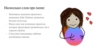 Документ описывает ключевые аспекты эффективного управления проектами, включая важность прозрачного общения и четкой формулировки задач. Автор, Ирина Мещерякова, делится опытом успешных и неудачных проектов, подчеркивая необходимость рефлексивного слушания и документирования встреч. Также акцентируется внимание на мотивации команды и клиента через живые примеры и четкое понимание целей проекта.