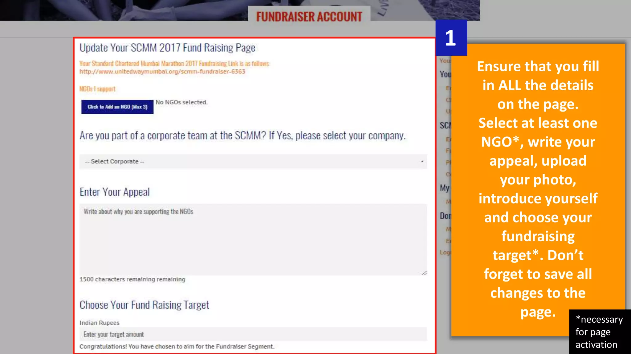 Follow these simple steps to edit your SCMM 2017 fundraising page now! Select at least one NGO and charity from a drop down list of over 200 options. Personalize your page by adding your photo, introducing yourself, writing an appeal, and choosing a fundraising target. You can also add up to 3 photos and 1 video link to your appeal. Once complete, your new fundraising page can be accessed via the link on your account dashboard.