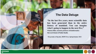Agricultural technology sharing needs open data. Johannes Keizer presented at a CAAS/GODAN workshop in Beijing about GODAN, which advocates making important agricultural and nutrition datasets global public goods and available to all. Open data from fields like genomics and viticulture can help increase food production and farmer livelihoods through applications in plant breeding and precision agriculture. However, open data also faces challenges in finding the right balance between openness and context. GODAN addresses these issues through working groups and partnerships to promote FAIR (findable, accessible, interoperable, reusable) open data principles.