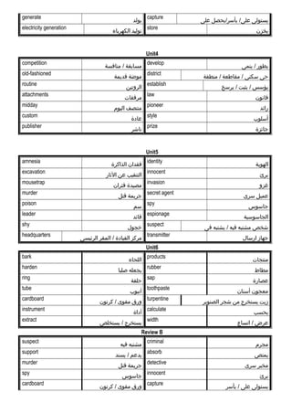 تتضمن الوثيقة مجموعة من الوحدات التعليمية التي تغطي مواضيع متنوعة مثل الجاذبية، الألعاب الأولمبية، الطاقة المتجددة، والهوية. تحتوي كل وحدة على مصطلحات وتعريفات مهمة تتعلق بالصناعات والتخصصات المختلفة. تمتد المحتويات لتغطي مجالات الفنون، العلوم، والتعليم، مما يشير إلى تنوع التعلم والتطوير المهني.