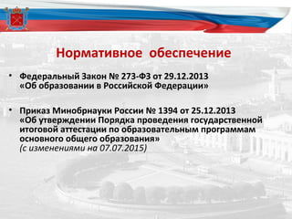 Документ описывает порядок проведения государственной итоговой аттестации по образовательным программам основного общего образования в 2016 году в России. Он включает в себя обязательные экзамены по русскому языку и математике, а также экзамены по выбору и определяет условия допуска участников, сроки подачи заявлений и расписание экзаменов. Также рассматриваются процедуры оценки результатов, повторной сдачи экзаменов и возможности апелляций.