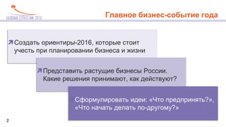 Документ описывает бизнес-стратегии на 2016 год, акцентируя внимание на диверсификации и внедрении новых технологий. Он представляет рекомендации по созданию партнерств с надежными бизнесами и сокращению капиталоемкости. Также обсуждаются глобальные тренды и необходимость масштабирования в рамках растущих отраслей.