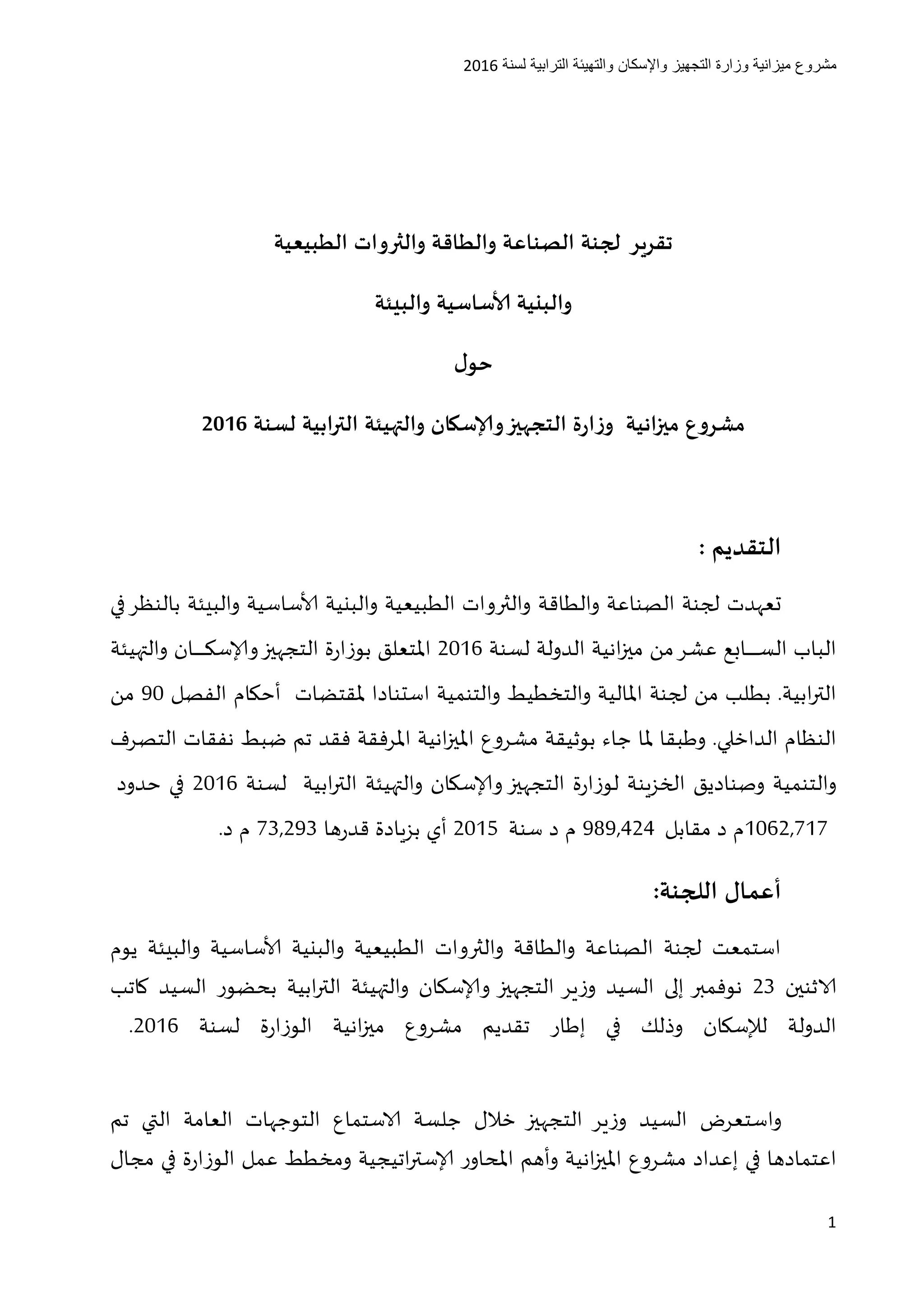 تتعلق الوثيقة بمشروع ميزانية وزارة التجهيز والإسكان لسنة 6102، حيث تسلط الضوء على مختلف الاستثمارات والتوجهات الاستراتيجية في تطوير البنية التحتية. تم تحديد أولويات مثل تنفيذ المشاريع الجديدة وتعزيز الشبكات الطرقية لتحقيق التنمية المستدامة. كما تناولت النقاشات أهمية المراقبة والرقابة لتطبيق المعايير المطلوبة في المشاريع.