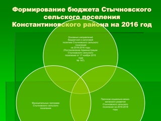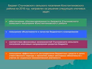 Документ описывает бюджет стычновского сельского поселения на 2016 год и основные направления бюджетной политики на 2016-2018 годы. Бюджет включает доходы в размере 9832 тыс. руб. и расходы в размере 10132 тыс. руб. с дефицитом 300 тыс. руб., а также перечисляет муниципальные программы, направленные на развитие и социальные нужды населения.