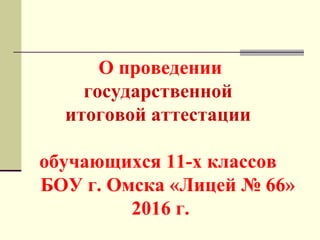 Документ описывает порядок проведения государственной итоговой аттестации для учащихся 11-х классов в лицее № 66 города Омска в 2016 году, включая ключевые нормативные документы, сроки подачи заявлений и расписание экзаменов. В нем указаны требования к участникам, формы экзаменов (ЕГЭ и ГВЭ) и условия для учащихся с ограниченными возможностями здоровья. Также рассматриваются вопросы апелляции и особенности допуска к экзаменам.