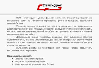 Компания 'Статус-грунт' предоставляет услуги по укреплению грунта и холодному ресайклингу асфальтобетона с использованием современных технологий, что позволяет эффективно и быстро строить дороги и другие инфраструктурные объекты. Основные преимущества технологии включают экономичность, использование местного грунта и минимальную необходимость в привозных материалах, что делает процесс строительства более устойчивым. Компания гарантирует высокое качество работ, поддерживает репутацию надежного партнера и реализует проекты по всей России и за рубежом.