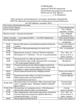 Документ содержит план основных организационных и культурно-зрелищных мероприятий библиотеки на апрель 2016 года, включая выставки, беседы, литературные часы и образовательные акции. Среди запланированных событий - мероприятия, связанные с именными юбилеями писателей, Международным днем патрулирования и историческими датами, такими как День Победы. Также упоминается участие в международных конгрессах и семинарах для библиотечных специалистов.
