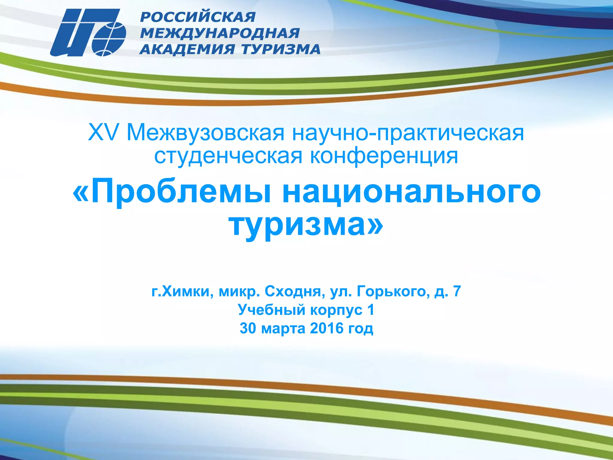 ХV межвузовская научно-практическая студенческая конференция «Проблемы национального туризма» прошла 30 марта 2016 года в г. Химки. Конференция включала пленарное заседание, секционные заседания и подведение итогов, охватывая темы от состояния туризма в России до новых подходов в управлении. Модераторами секций стали преподаватели различных кафедр, что подчеркивает многообразие обсуждаемых вопросов.