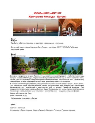 Документ описывает туристическую программу на 15-дневную поездку в Батуми и его окрестности, включая экскурсии, культурные мероприятия и посещение природных достопримечательностей. Программа включает размещение в отелях, питание, транспортные услуги и входные билеты, но не включает авиаперелеты и некоторые развлечения. Основное внимание уделяется экскурсиям в ботаническом саду, старинных крепостях и курортах, а также развлекательным мероприятиям в молодежных парках и на пляжах.