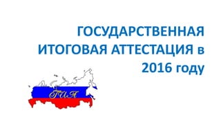 Документ охватывает нормативно-правовые акты, касающиеся государственной итоговой аттестации в 2016 году в России. Он включает федеральные законы и приказы, инструкции по проведению экзаменов, а также условия для участия обучающихся, включая тех, кто имеет ограниченные возможности здоровья. Также описаны особенности проведения единого государственного экзамена (ЕГЭ) и государственного выпускного экзамена (ГВЭ) по различным предметам.