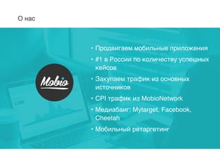 Документ описывает стратегии продвижения мобильных приложений, включая методы закупки трафика и различные рекламные платформы, такие как Facebook и Yandex. Также приводятся примеры успешных кейсов, таких как Mailbox и WeChat, и анализируются результаты рекламных кампаний с показателями установок, расходов и доходов. Особое внимание уделяется таргетингу аудитории и оптимизации рекламных объявлений для достижения высоких результатов.