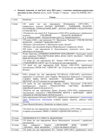• Основні знаменніта пам’ятні дати 2016 року і тематика книжково-журнальних