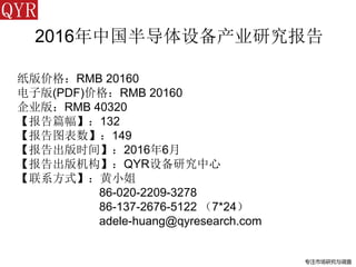 2016年中国半导体设备产业研究报告提供了半导体设备市场的详尽分析,包括生产成本、销售渠道及行业趋势等信息。报告涵盖2011-2021年的数据统计和预测,旨在为客户提供支持和决策依据。文档还引用了技术人员和营销人员的支持,强调研究的客观性和深度。