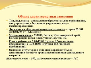 Документ описывает характеристики дошкольной образовательной организации, включая её тип, местонахождение, режим работы и количество воспитанников. Также рассматриваются приоритетные задачи, методы работы с родителями, особенности образовательного процесса, доступные образовательные услуги и внимание к здравоохранению детей. В дополнение, представлена информация о материально-технической базе, кадровом потенциале и финансовом обеспечении учреждения.