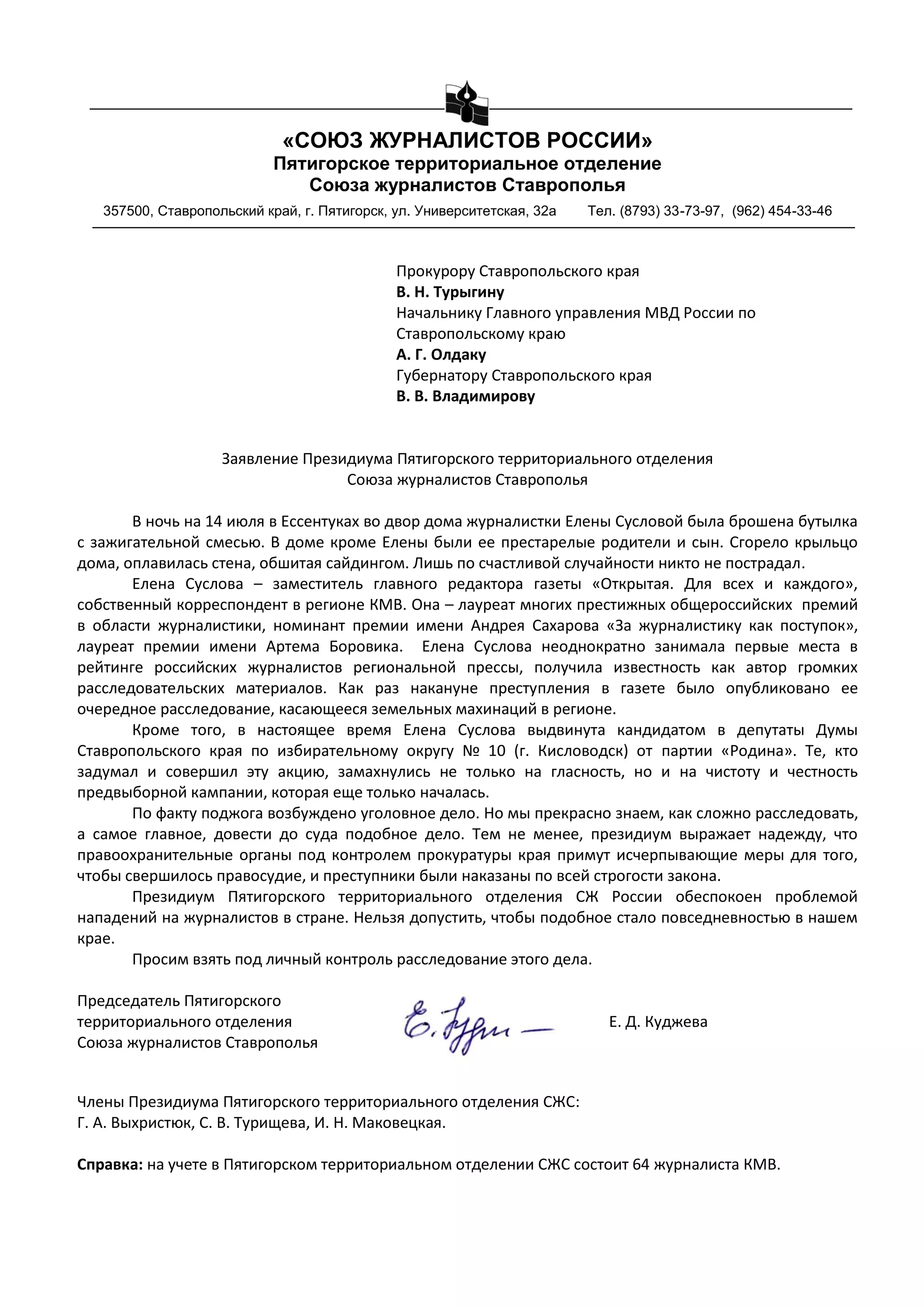 Президиум пятигорского территориального отделения Союза журналистов Ставрополья выразил обеспокоенность после поджога дома журналистки Елены Сусловой, которая стала жертвой нападения на фоне ее расследования земельных махинаций. Несмотря на отсутствие пострадавших, инцидент угрожает свободе слова и честности предвыборной кампании, в которой Суслова участвует как кандидат в депутаты. Уголовное дело по факту поджога возбуждено, и президиум призывает правоохранительные органы к скорейшему расследованию и защите журналистов.
