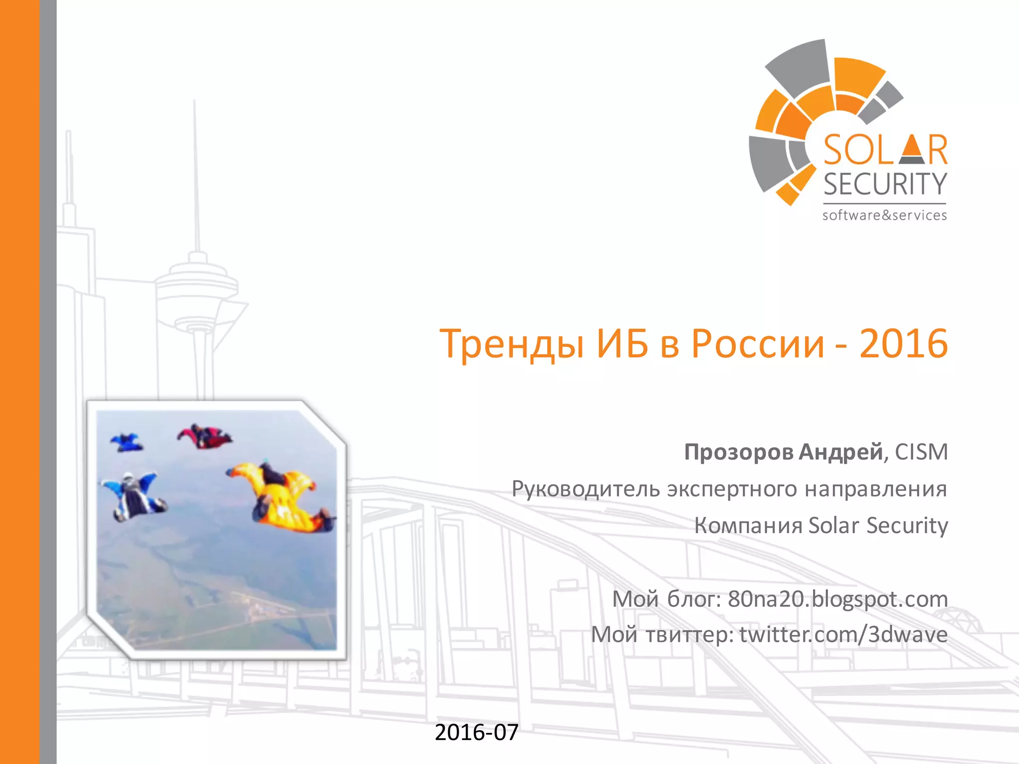 Документ описывает текущие тенденции и угрозы в области информационной безопасности в России на 2016 год, включая ситуацию с кибератаками и изменения в регулировании. В нем также упоминаются статистика инцидентов, усилия Центра мониторинга и реагирования на кибератаки, а также важность аутсорсинга в обеспечении безопасности. Основное внимание уделено новым требованиям и инициативам в области защиты информации и безопасности данных.