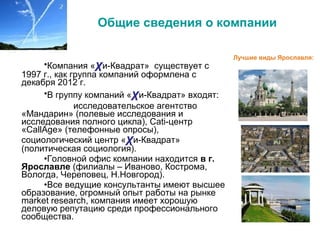 Группа компаний «χи-квадрат», основанная в 1997 году, занимается консалтингом и исследованиями в области маркетинга и социологии. Она обеспечивает полный цикл услуг, включая ad hoc проекты, и имеет разветвленную сеть офисов и интервьюеров в России и рядах стран СНГ. Основные клиенты компании включают крупных российских и международных игроков на различных рынках, а также местные власти и политические партии.