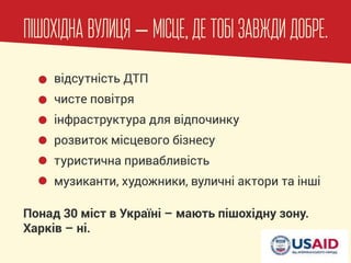 Активісти лобіюють створення в історичному центрі Харкова пішохідної туристичної зони, вільної від транспорту та парковок. Презентація здобутків адвокаційної кампанії в рамках проекту USAID “Популяризація сталого та безпечного транспорту”відбулась на Велофорумі-2016 у Харкові. Громадським активістам на всіх етапах кампанії допомагає Асоціація велосипедистів Києва.