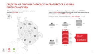 Документ содержит информацию о системе платных парковок в Москве и использовании средств, полученных от них, на благоустройство районов. С 2012 по 2016 годы были выделены значительные суммы на благоустройство, а также приведены примеры конкретных мероприятий, реализованных благодаря этим средствам. В документе также упоминаются контактные данные и адреса сервисных центров Московского транспорта.