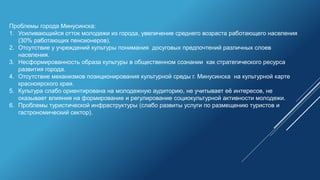 Документ обсуждает проблемы и ресурсы развития города Минусинска как культурно-исторического центра Красноярского края. Основные проблемы включают отток молодежи, недостаток понимания досуговых предпочтений и слабую туристическую инфраструктуру. Привлечение местных ресурсов и участие сообщества в развитии культурных инициатив рассматриваются как ключевые шаги для решения данных проблем.