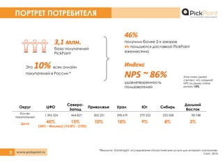 Документ содержит анализ потребительского поведения в 2016 году, включая информацию о базе получателей компании PickPoint и их удовлетворенности услугами. Основные выводы включают высокий индекс NPS пользователей и внимание на тренды в предпочтениях покупателей, таких как удобство получения заказов вне рабочего времени. Данные также указывают на высокую конверсию покупателей с международных платформ на российские интернет-магазины.