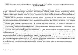 Доклад акима абайского района Шымкента подводит итоги работы за 2016 год и обозначает ключевые задачи на 2017 год, включая работу по обращению граждан и благоустройству района. За отчетный год проведены встречи с населением, поступило множество предложений и замечаний, на которые разработаны планы мероприятий. Также озвучены достижения по благоустройству, обеспечению безопасностью и социальной инфраструктуре в районе.
