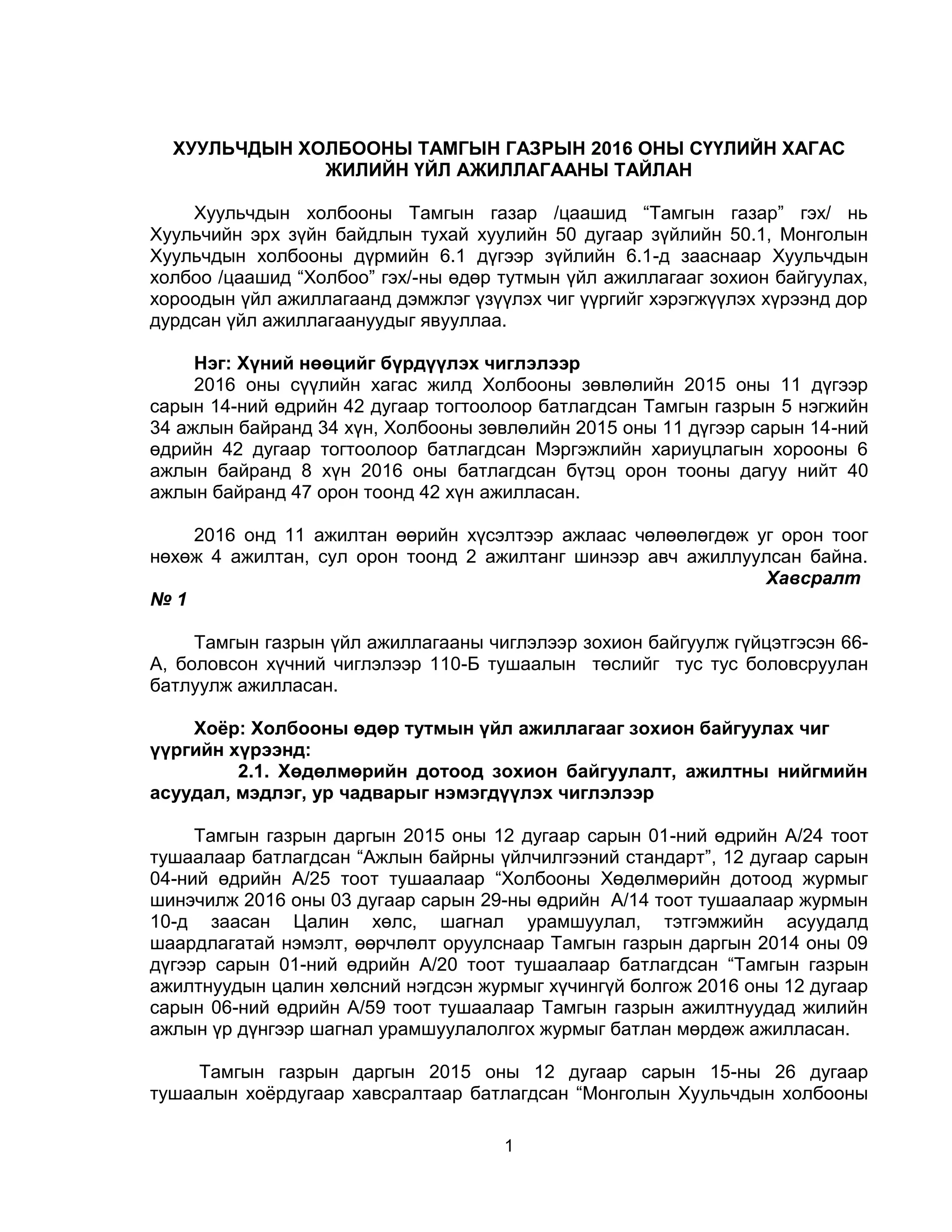 ГАЗРЫН 2016 ОНЫ СҮҮЛИЙН ХАГАС ЖИЛИЙН ҮЙЛ АЖИЛЛАГААНЫ ТАЙЛАН Хуульчдын холбооны Тамгын газар /цаашид “Тамгын газар” гэх/ нь Хуульчийн эрх зүйн байдлын тухай хуулийн 50 дугаар зүйлийн 50.1, Монголын Хуульчдын холбооны дүрмийн 6.1 дүгээр зүйлийн 6.1-д зааснаар Хуульчдын холбоо /цаашид “Холбоо” гэх/-ны өдөр тутмын үйл ажиллагааг зохион байгуулах, хороодын үйл ажиллагаанд дэмжлэг үзүүлэх чиг үүргийг хэрэгжүүлэх хүрээнд дор дурдсан үйл ажиллагаануудыг явууллаа. Нэг: Хүний нөөцийг бүрдүүлэх чиглэлээр 2016 оны сүүлийн хагас жилд Холбооны зөвлөлийн 2015 оны 11 дүгээр сарын 14-ний өдрийн 42 дугаар тогтоолоор батлагдсан Тамгын газрын 5 нэгжийн 34 ажлын байранд 34 хүн, Холбооны зөвлөлийн 2015 оны 11 дүгээр сарын 14-ний өдрийн 42 дугаар тогтоолоор батлагдсан Мэргэжлийн хариуцлагын хорооны 6 ажлын байранд 8 хүн 2016 оны батлагдсан бүтэц орон тооны дагуу нийт 40 ажлын байранд 47 орон тоонд 42 хүн ажилласан. 2016 онд 11 ажилтан өөрийн хүсэлтээр ажлаас чөлөөлөгдөж уг орон тоог нөхөж 4 ажилтан, сул орон тоонд 2 ажилтанг шинээр авч ажиллуулсан байна. Хавсралт № 1 Тамгын газрын үйл ажиллагааны чиглэлээр зохион байгуулж гүйцэтгэсэн 66- А, боловсон хүчний чиглэлээр 110-Б тушаалын төслийг тус тус боловсруулан батлуулж ажилласан. Хоёр: Холбооны өдөр тутмын үйл ажиллагааг зохион байгуулах чиг үүргийн хүрээнд: 2.1. Хөдөлмөрийн дотоод зохион байгуулалт, ажилтны нийгмийн асуудал, мэдлэг, ур чадварыг нэмэгдүүлэх чиглэлээр Тамгын газрын даргын 2015 оны 12 дугаар сарын 01-ний өдрийн A/24 тоот тушаалаар батлагдсан “Ажлын байрны үйлчилгээний стандарт”, 12 дугаар сарын 04-ний өдрийн A/25 тоот тушаалаар “Холбооны Хөдөлмөрийн дотоод журмыг шинэчилж 2016 оны 03 дугаар сарын 29-ны өдрийн А/14 тоот тушаалаар журмын 10-д заасан Цалин хөлс, шагнал урамшуулал, тэтгэмжийн асуудалд шаардлагатай нэмэлт, өөрчлөлт оруулснаар Тамгын газрын даргын 2014 оны 09 дүгээр сарын 01-ний өдрийн A/20 тоот тушаалаар батлагдсан “Тамгын газрын ажилтнуудын цалин хөлсний нэгдсэн журмыг хүчингүй болгож 2016 оны 12 дугаар сарын 06-ний өдрийн А/59 тоот тушаалаар Тамгын газрын ажилтнуудад жилийн ажлын үр дүнгээр шагнал урамшуулалолгох журмыг батлан мөрдөж ажилласан. Тамгын газрын даргын 2015 оны 12 дугаар сарын 15-ны 26 дугаар тушаалын хоѐрдугаар хавсралтаар батлагдсан “Монголын Хуульчдын холбооны