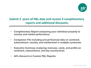 STR offers a profitability program for hotels to compare their financial performance against competitors by submitting two years of P&L data. Participants receive three complimentary reports, including an individual property comparison to market performance and financial summaries at multiple levels. The document also outlines key performance metrics and changes in revenue, costs, and profits for various European and Asia Pacific markets for the year 2015.