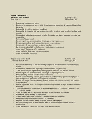 This resume is for Staci Fors, who is seeking a challenging position utilizing her organizational, leadership, and people skills. She has over 15 years of experience in office management, customer service, and banking compliance roles. Her most recent role is Assistant Bank Office Manager at Bank Mutual, where she coaches employees, ensures regulatory compliance, and improved her office's performance rankings. She also held previous roles with increasing responsibilities in banking support, scanning, and bookkeeping. Staci has an Associate's degree in Business Administration and is proficient in various software programs.