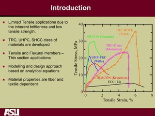 This document discusses research on the mechanical properties of unidirectional polypropylene fiber cement composites. The research aims to study the properties of hydrophilic micro PP fibers compared to existing macro fiber technology in developing structural members. Tension and flexural tests on laminate systems with continuous fibers show that both macro and micro PP fibers increase strength and toughness with higher fiber volumes. Digital image correlation analysis indicates fibers promote distributed cracking and strain hardening behavior through mechanisms like crack bridging and pullout. The continuous fiber composites show potential for thin slab applications if design standards consider their strain hardening properties.