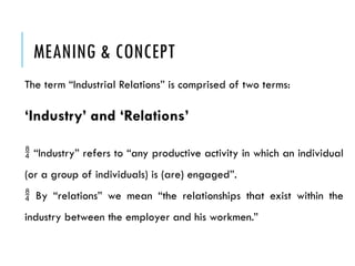 The document provides an overview of industrial relations, covering its meaning as the relationship between employees and employers, and various definitions and objectives. It outlines four approaches to industrial relations: unitary, pluralistic, Marxist, and systems approach, detailing their characteristics and implications. Additionally, it discusses factors affecting industrial relations, the roles of employees, employers, and the state, and highlights the importance of fostering cooperation and resolving conflicts within the workplace.